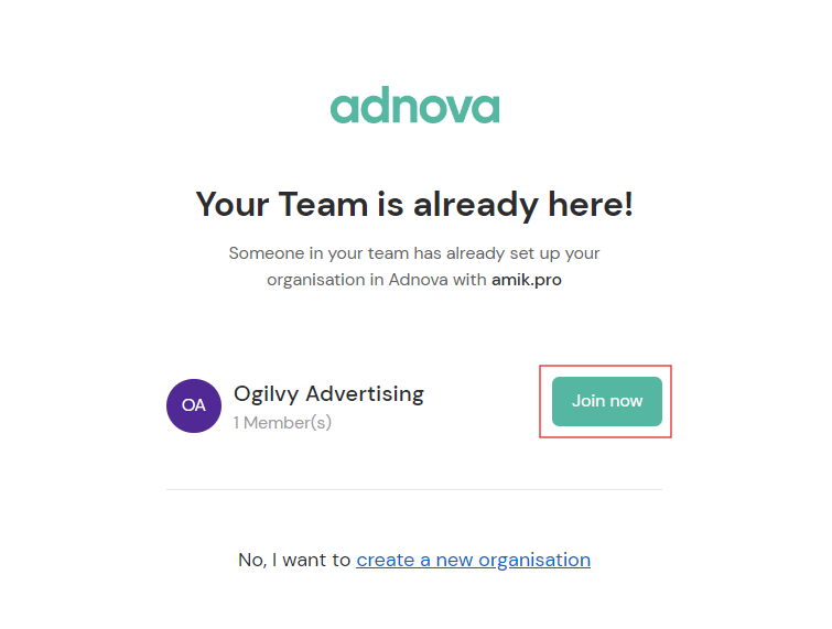 2. Else, you can join your company's existing organisation by clicking "**Join now"** and have to contact the "**Organisation Admin**" to get access to any [Workspaces](https://adnova.gitbook.io/adnova-academy/account-set-up/workspaces)&#x20;