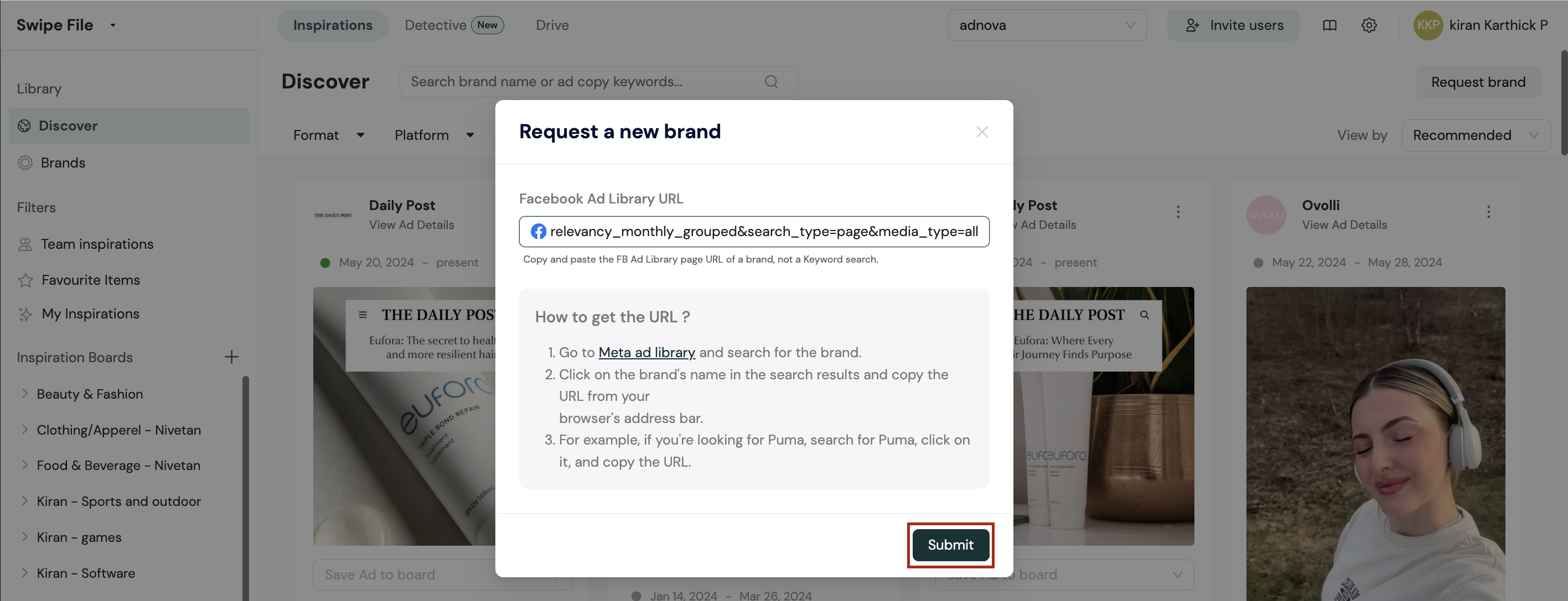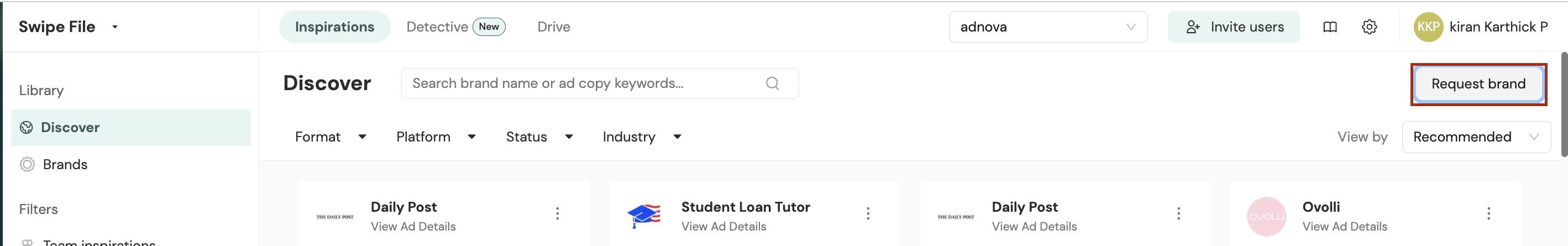 If you cannot find a specific brand in the Discover Ad Library, you have the option to request its addition to Adnova.