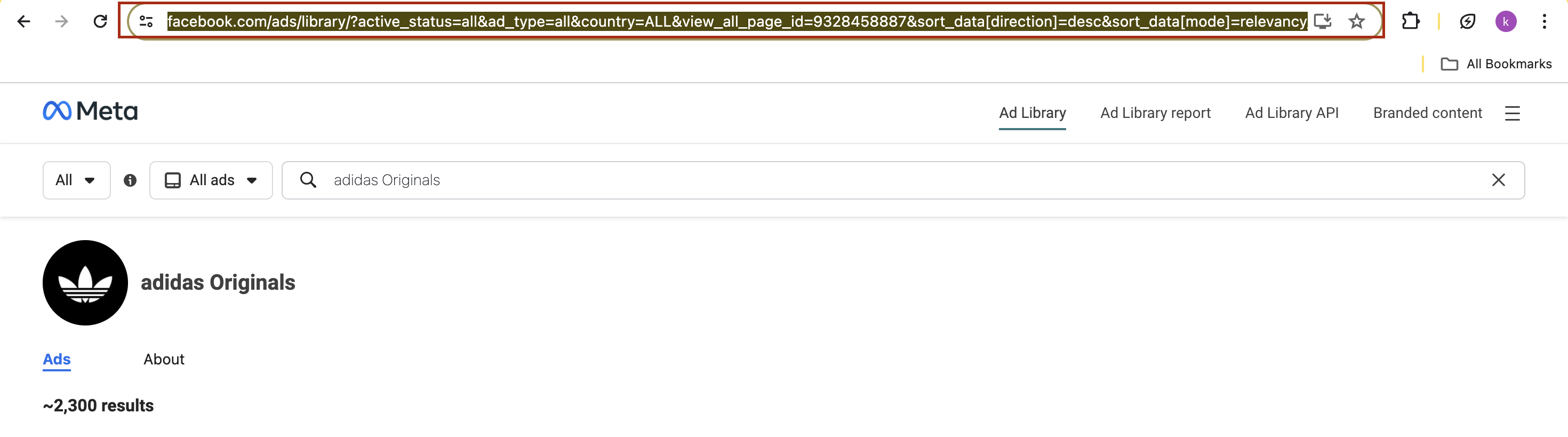 1. Navigate to the Meta Ad Library and search for the brand you wish to add to Adnova. Now, copy the Meta Ad Library URL of the brand.